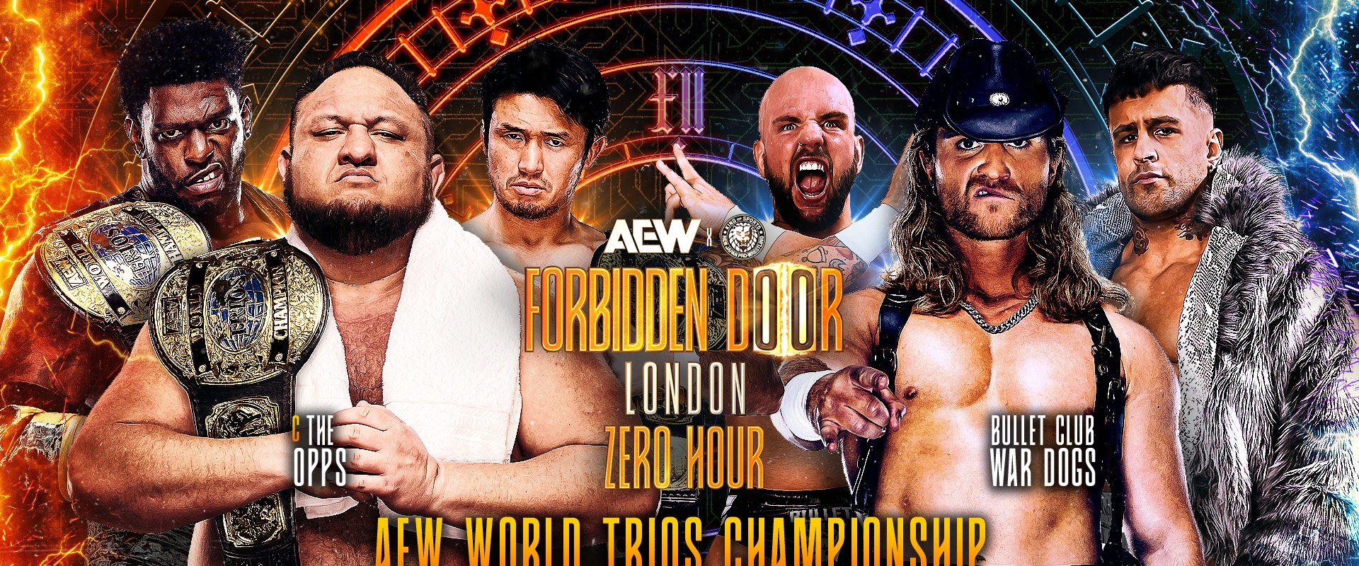 Forbidden Door fand 2025 am 24.08. in der O2 Arena in London, England, statt. Es war eine gemeinsam Produktion von All Elite Wrestling (AEW) und New Japan Pro-Wrestling (NJPW). Der Abend startete AEW üblich mit der Zero Hour. Match Card: Eight Man Tag Team Match: El Desperado, Paragon (Kyle O'Reilly & Roderick Strong) & Yuya Uemura vs. CRU (Action Andretti & Lio Rush) & The Don Callis Family (Hechicero & Josh Alexander) Six Man Tag Team Match: Gates Of Agony (Bishop Kaun & Toa Liona) & Ricochet vs. JetSpeed (Kevin Knight & Mike Bailey) & Michael Oku Eight Man Tag Team Match: Megan Bayne & Triangle Of Madness (Julia Hart, Skye Blue & Thekla) vs. Harley Cameron, Kris Statlander, Queen Aminata & Willow Nightingale AEW World Trios Title Match: The Opps (Katsuyori Shibata, Powerhouse Hobbs & Samoa Joe) (c) vs. BULLET CLUB War Dogs (Clark Connors, Drilla Moloney & Robbie X)